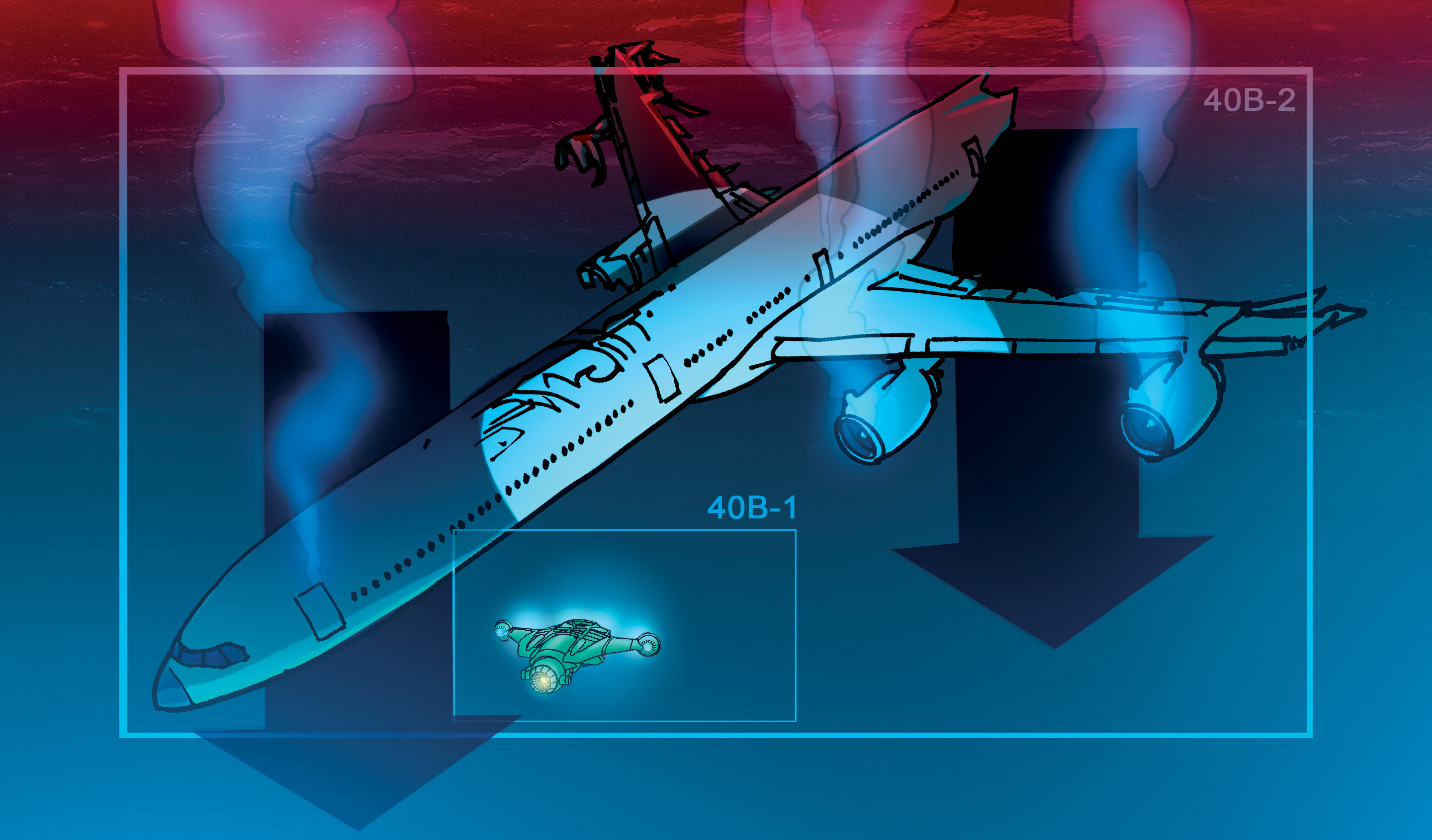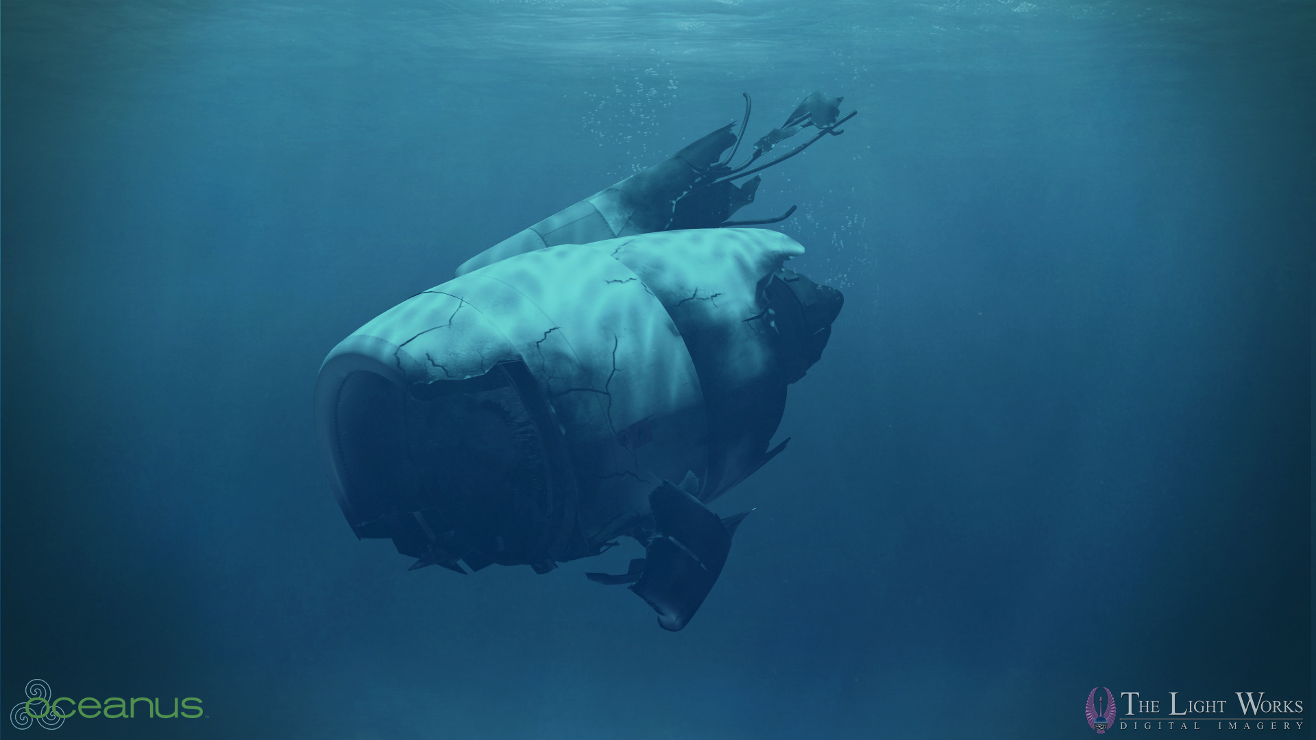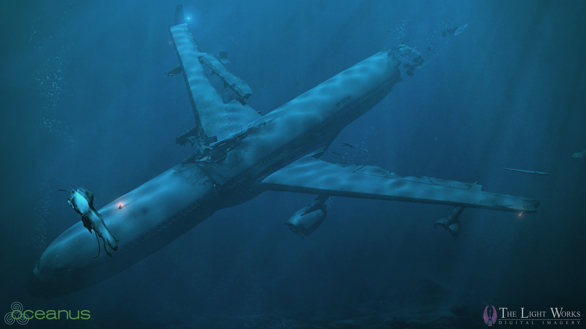 During the writing of Oceanus, Jeffrey Morris and Kimberly Morris needed a way to portray how disconnected being underwater was for the biologist. Kimberly imagined an object from the surface forced underwater. She explains, “If devastation like this happened, anything in the air would be destroyed.” She felt that a plane would accurately show the strength of the devastation and serve as a link to the surface, while staying believable. The concept of the sinking airplane was perfect.